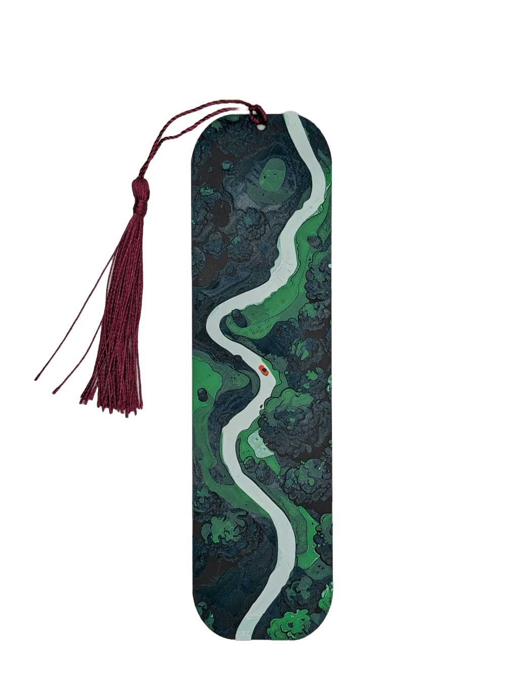 Lesezeichen im Roadtrip-Design mit geschwungener Route auf dunklem Hintergrund in Grün, ergänzt durch eine Quaste. Schlicht, modern und ideal für Bücher, Manga oder Journals. Liegt flach im Buch und markiert die Seite zuverlässig. Passend als kleines Geschenk für Reise- und Naturfans.